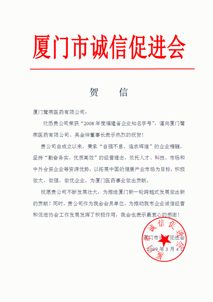 廈門市誠(chéng)信促進(jìn)會(huì)賀信