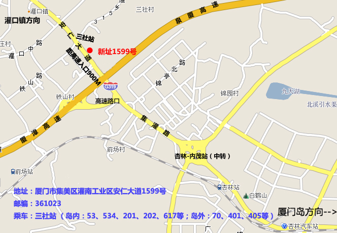 新址乘車:安仁大道—三社站(工業(yè)區(qū)路口)下車即可(島內:可乘坐53、534、201、202、617公交車;島外可乘坐70、401、405公交車),位置示意圖如下: