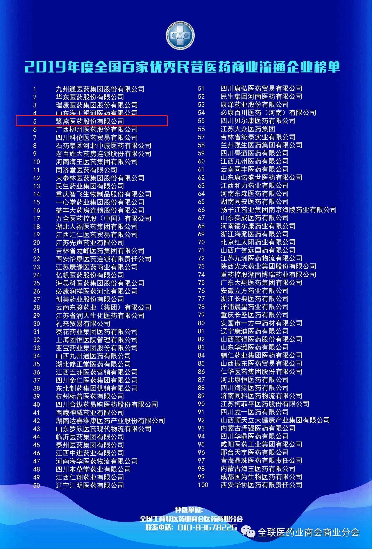 2020年9月11日,“第二屆全國民營醫(yī)藥商業(yè)企業(yè)家高峰論壇暨2019年度全國百家優(yōu)秀民營醫(yī)藥商業(yè)流通企業(yè)榜單發(fā)布會”在成都召開?;顒蝇F(xiàn)場揭曉了全國百家優(yōu)秀民營醫(yī)藥商業(yè)流通企業(yè)榜單,鷺燕醫(yī)藥股份有限公司(以下簡稱“鷺燕醫(yī)藥”)憑借穩(wěn)扎穩(wěn)打的優(yōu)秀實力,榮登榜單第五位。