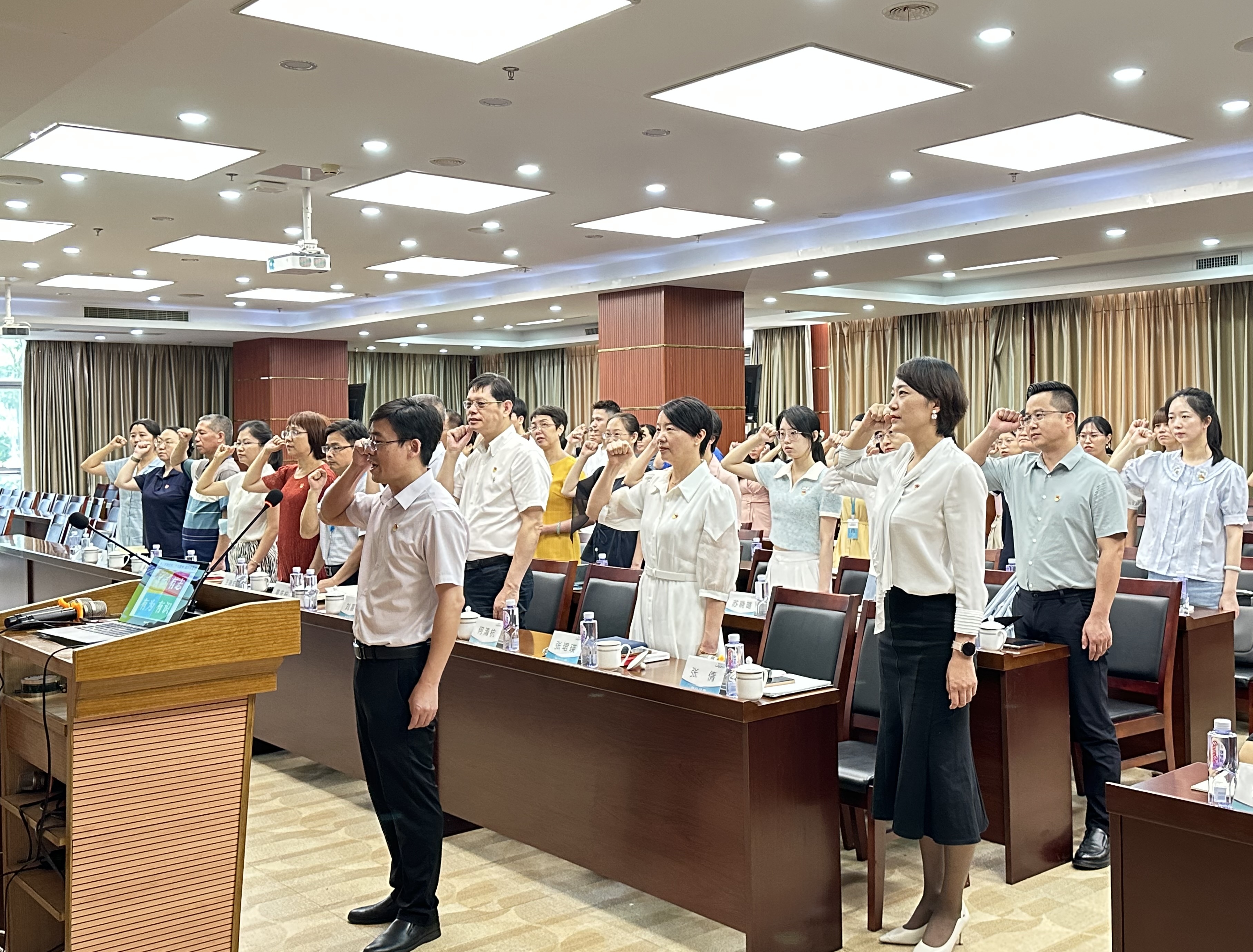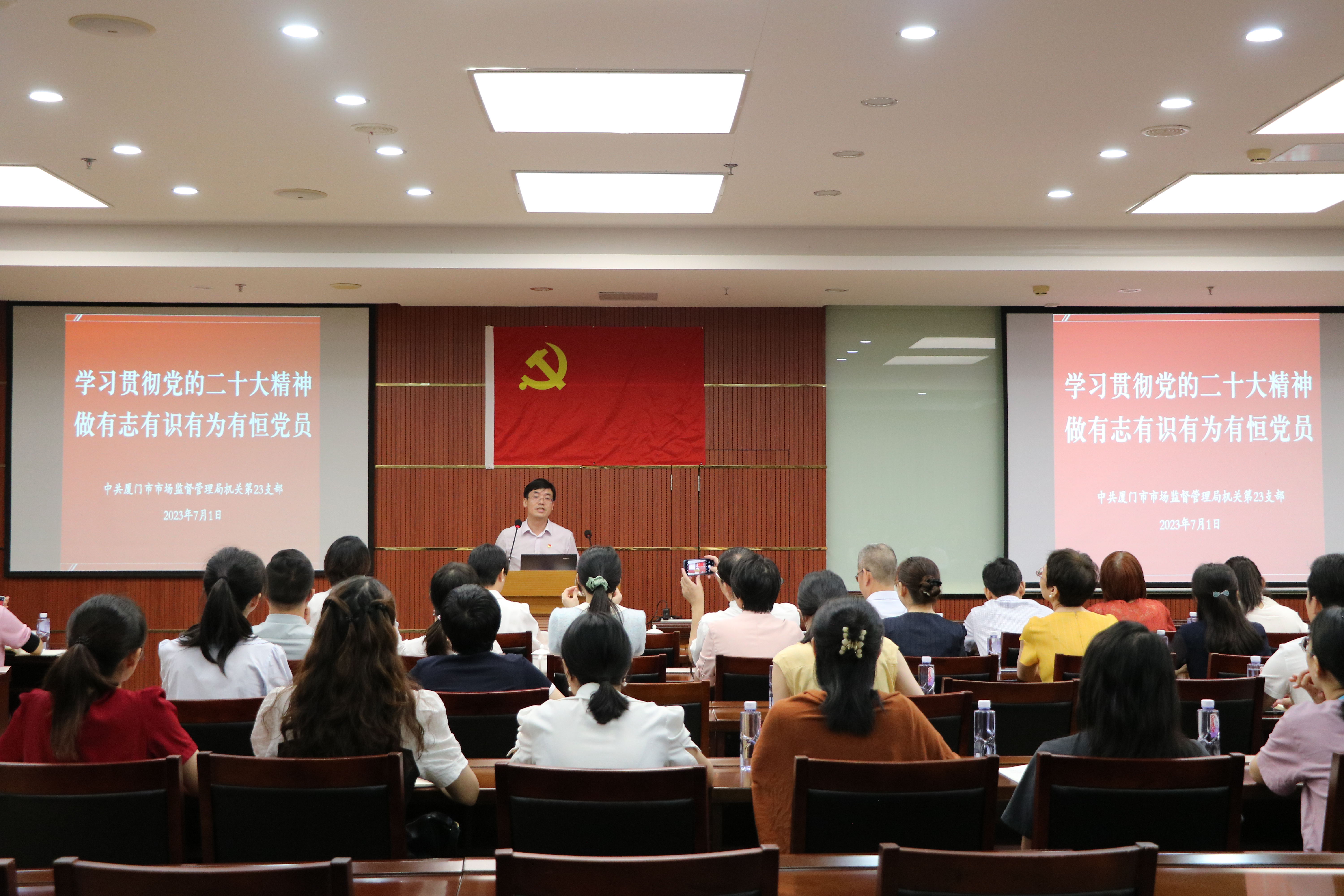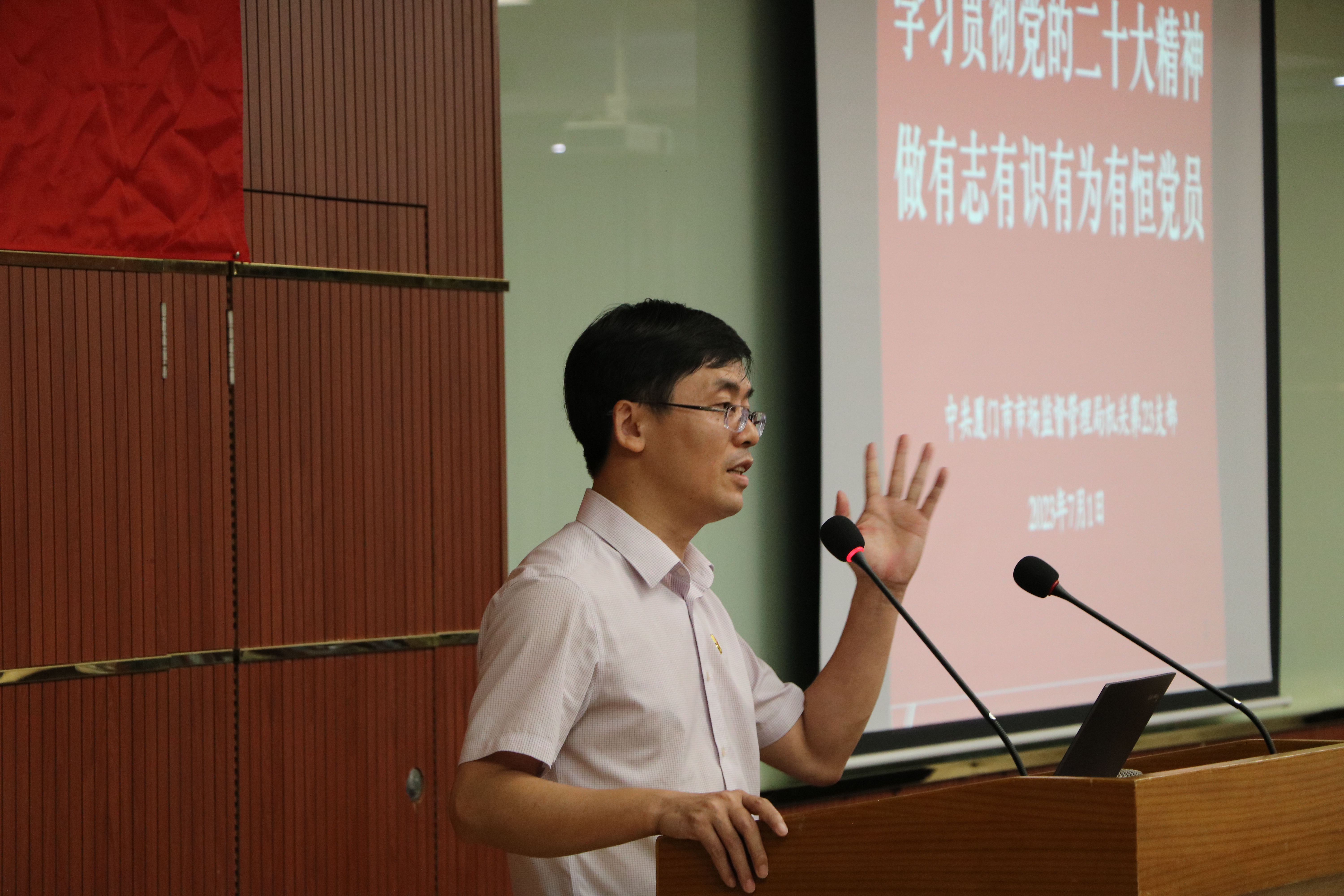 在這次聯(lián)建共建中,中共廈門市市場(chǎng)監(jiān)督管理局機(jī)關(guān)第二十三支部何清杭書記帶來了一堂《學(xué)習(xí)貫徹黨的二十大精神,做有志有識(shí)有為有恒黨員》的主題黨課。授課前,何書記作為領(lǐng)誓員,脫稿帶領(lǐng)大家一起重溫入黨誓詞,全體黨員面對(duì)鮮紅的黨旗,莊嚴(yán)地舉起右拳,鏗鏘有力、擲地有聲地宣讀誓詞。