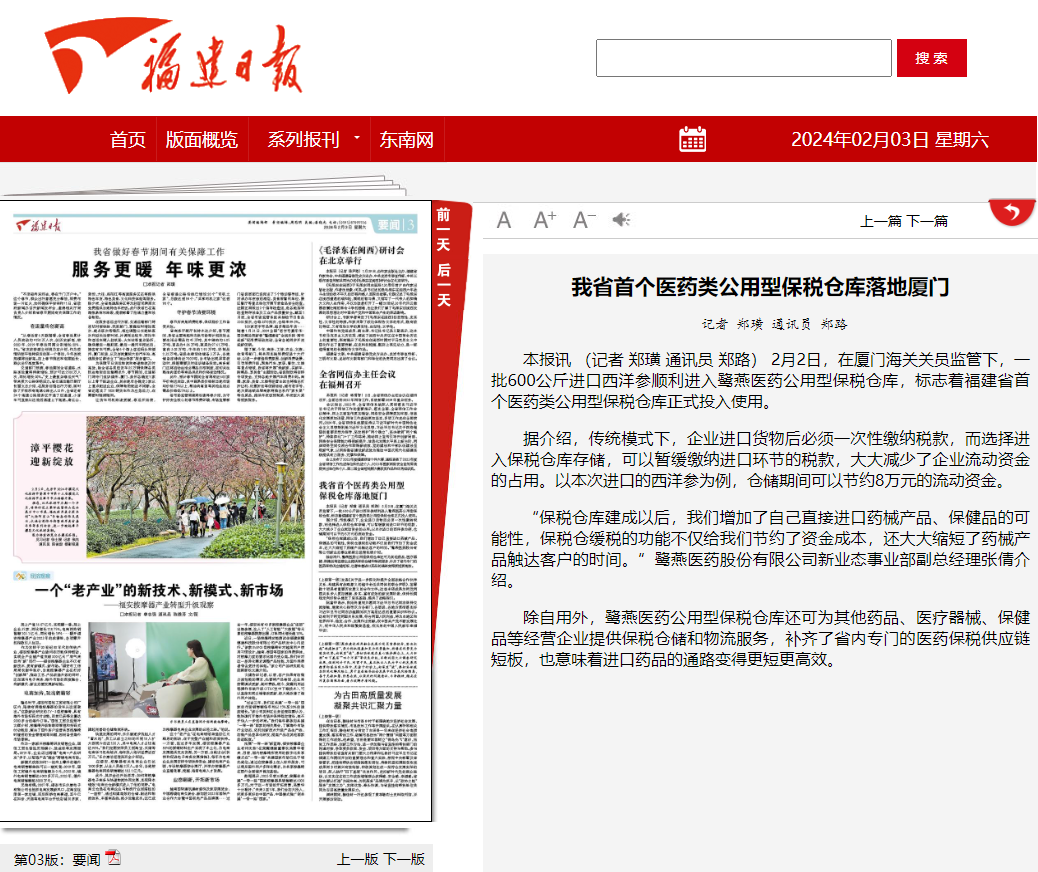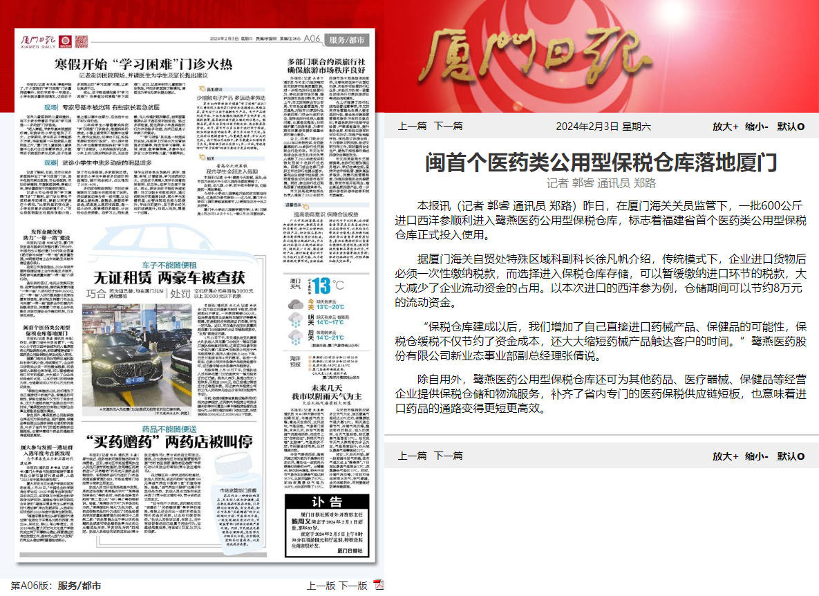 2024年2月2日,鷺燕醫(yī)藥公用型保稅倉獲批投用,《福建日?qǐng)?bào)》《廈門日?qǐng)?bào)》相繼報(bào)道相關(guān)新聞。鷺燕醫(yī)藥公用型保稅倉是福建省首個(gè)醫(yī)藥類公用型保稅倉庫,該保稅倉庫的投用,意味著廈門市乃至福建省補(bǔ)齊了區(qū)域內(nèi)專門的醫(yī)藥保稅供應(yīng)鏈物流服務(wù),也意味著廈門和福建進(jìn)口藥品的通路變得更短,更為高效。
